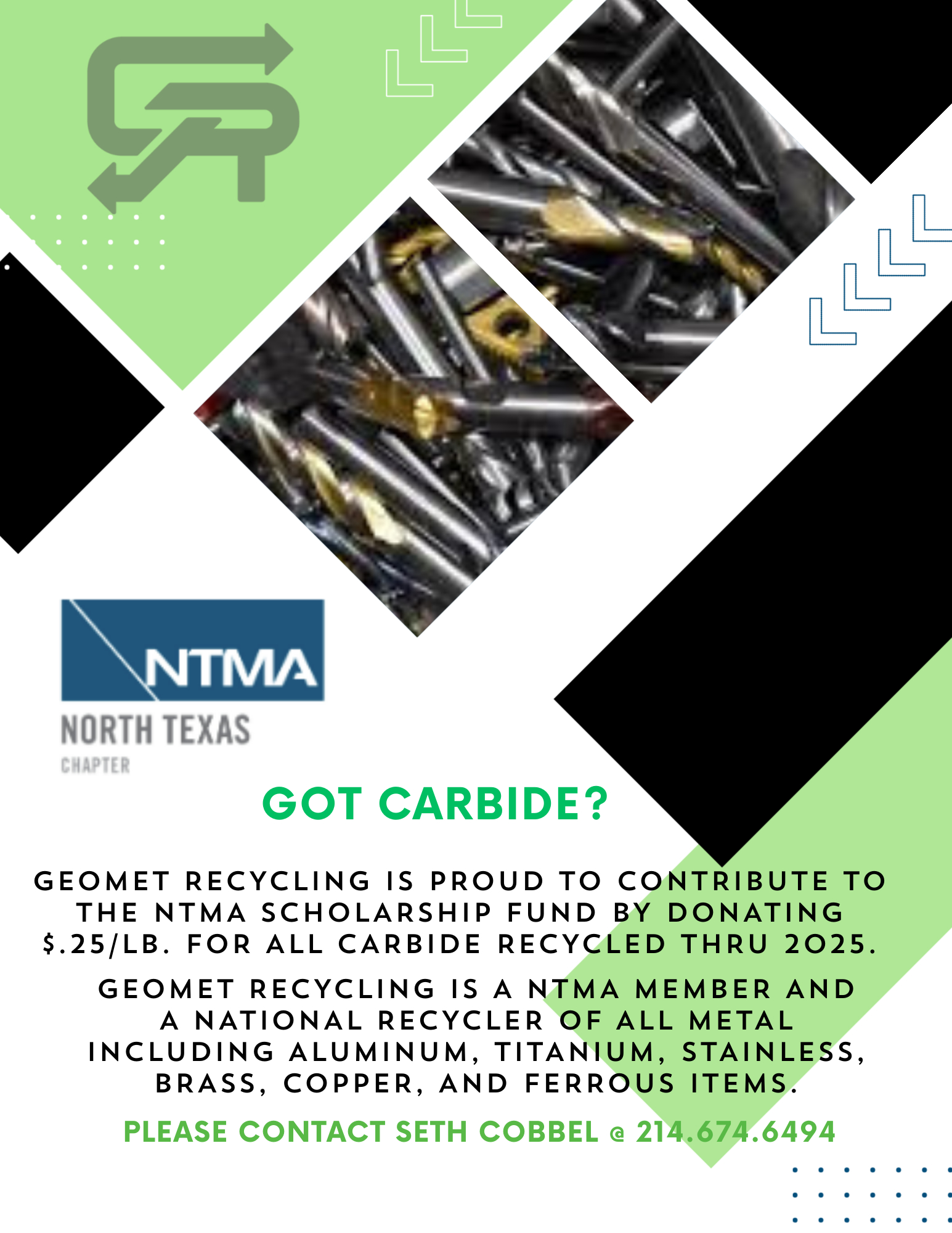 Geomet Recycling is proud to contribute to the NTMA Scholarship fund by donating $.25/lb for all carbide receycled through 2025. Geomet Recycling is a national recycler of all metal including aluminum, titanium, staninless, brass, copper, and ferrous items. Click to Dowload Flyer Here.