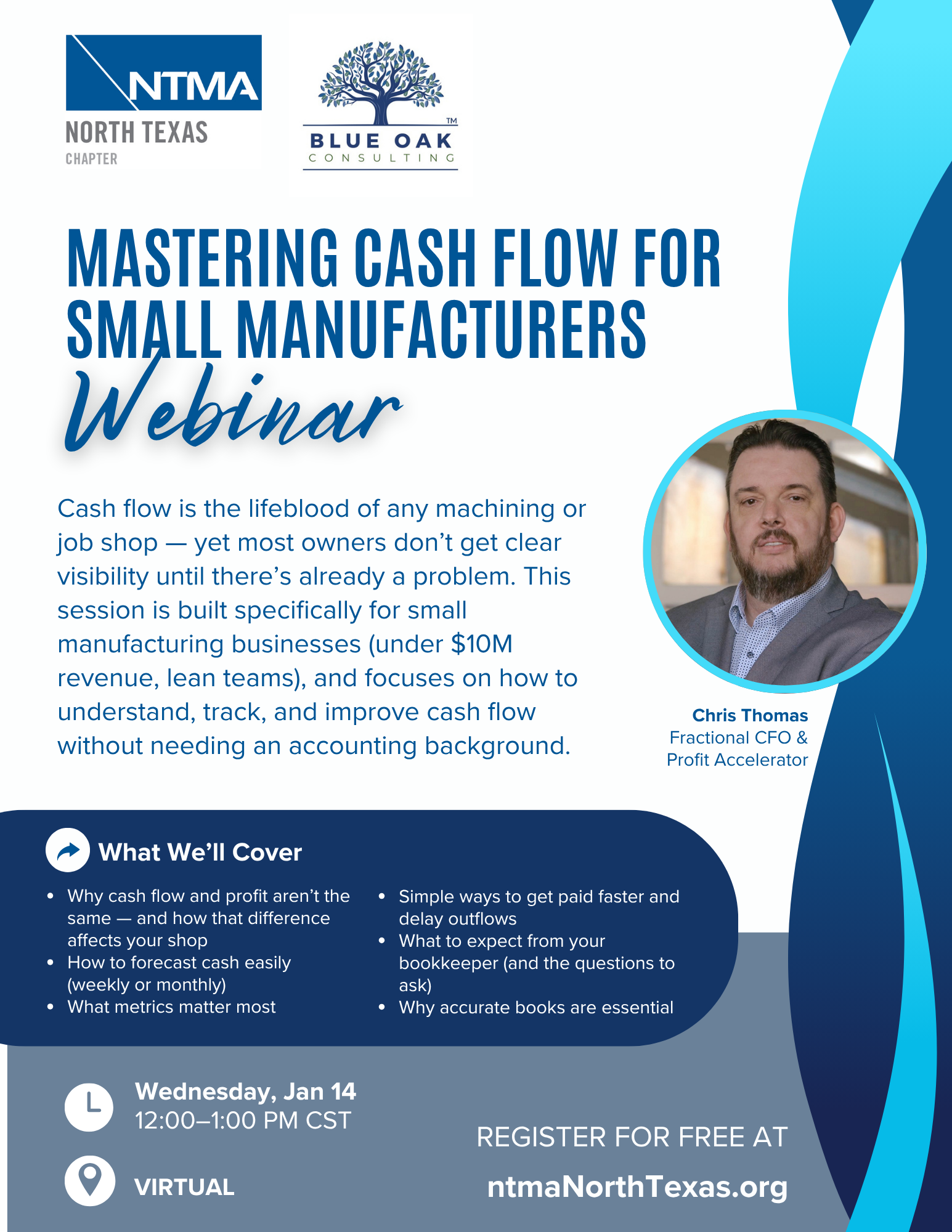 Cash flow is the lifeblood of any machining or job shop — yet most owners don’t get clear visibility until there’s already a problem. This session is built specifically for small manufacturing businesses (under $10M revenue, lean teams), and focuses on how to understand, track, and improve cash flow without needing an accounting background.